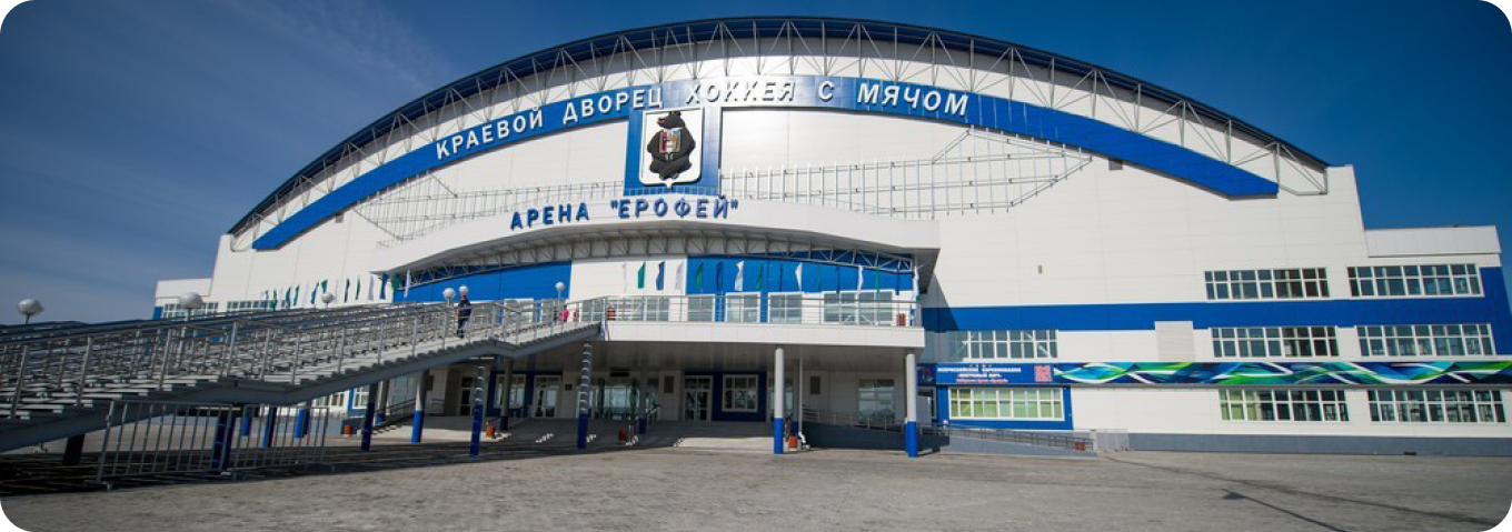 Краевой дворец хоккея с мячом «Арена «Ерофей» представляет собой современное спортивное сооружение на 10 тысяч зрительских мест со всей необходимой инфраструктурой для проведения соревнований всероссийского и международного уровней.