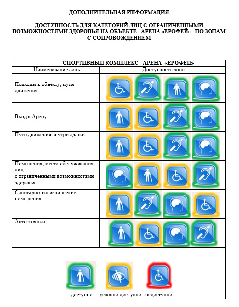 Доступная среда в Арене «Ерофей». Арена "Ерофей" оборудована отдельной стоянкой для автомобилей, местами для инвалидных колясок, специальными оборудованными туалетами, тактильными знаками и кнопками вызова персонала, адаптированными для людей с ограниченными возможностями. Все это делает арену "Ерофей" полностью доступной и удобной для посещения и использования для лиц с ограниченными возможностями.